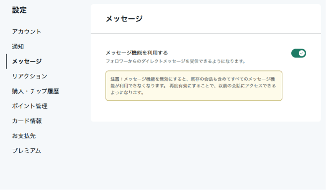 既存の会話をもう一度見たくなった場合は、「メッセージ機能を利用する」をONに戻すことで、この機能がまた使えるようになり、メッセージも見られるようになります。
